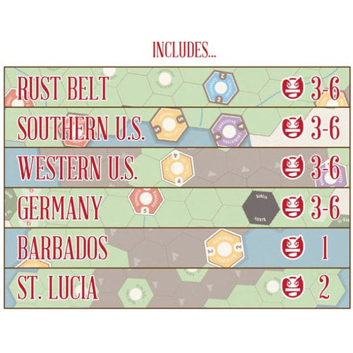 • 3 Double-Sided Game Boards (Rust Belt, Western U.S., Southern U.S., Germany, Barbados, and St. Lucia) -- all mounted on 2mm thick and durable game board stock