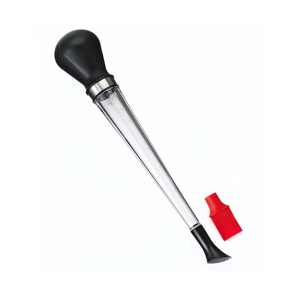 Cuisipro 3-in-1 baster includes a silicone brush to coat food evenly and a nylon shower head for a wide shower for quick basting or use without attachments for a heavy stream of juice. Large and comfortable silicone bulb that is comfortable to grip and easy to squeeze. Clear window with measurements included on the main body of the baster. Versatile, safe, lightweight and easy to use. Top shelf dishwasher safe..