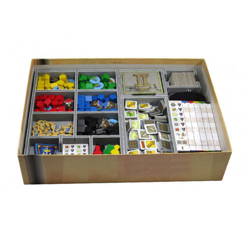 • This insert is designed to be compatible with Orleans®, and includes space for the 5th player expansion. The design provides both efficient storage and improved game play. Many of the trays can be utilised during the game, and they greatly aid set-up and clear-away times. The boards and player boards act as a lid on top of the trays.