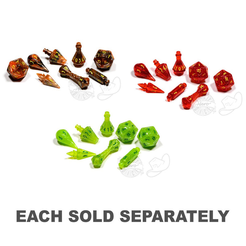 Only the bravest minds ponder the mysteries of the arcane. Cast forth a synthesis of custom dice for your favorite RPGs that will hold a respected place in your collection. Each PolyHero Wizard 8 Dice Set comes with 8 dice: D4 Bolt, D6 Fireball, D8 Scroll, 2 D10 Potions, D12 Wand, and 2 D20 Orbs