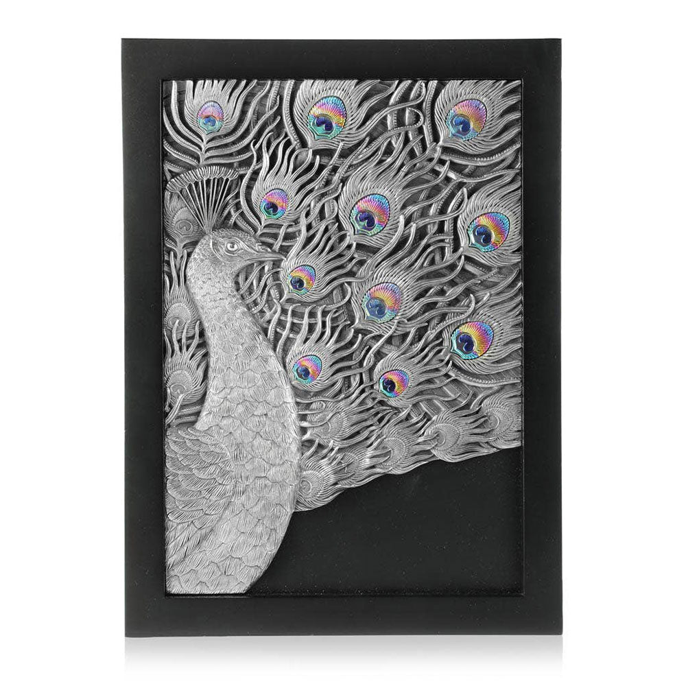 Sculpted pewter brings rich texture and dimension to the proud peacock, contrasted further by a satin finish black nyatoh frame. Niobium, a rare metal which shimmers with iridescence when anodised, decorates the feathers' signature ocelli.