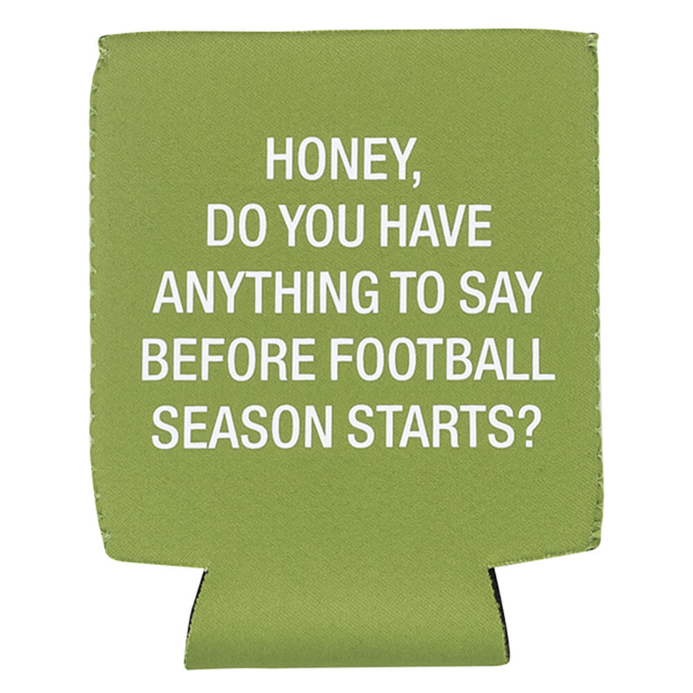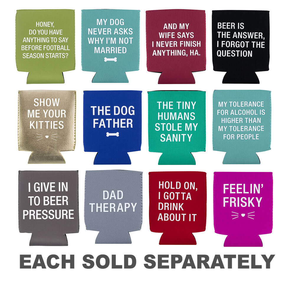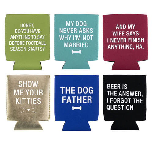Show off your love for your canine companion with this blue neoprene drink holder from SAY WHAT?. Caption reads: 'My Dog Never Asks Why I'm Not Married'. Product measures 12cm x 10cm.