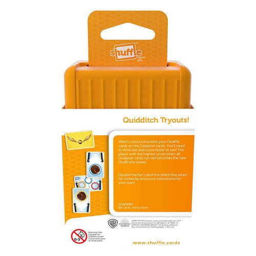 Quidditch Tryouts! Match colours and slam your Quaffle cards on the Goalpost cards. You'll need to think fast and score faster to win! The player with the highest score when all Goalpost cards run out becomes the new Gryffindor player. Double the fun: catch the snitch first when he comes by and score extra points for your team.