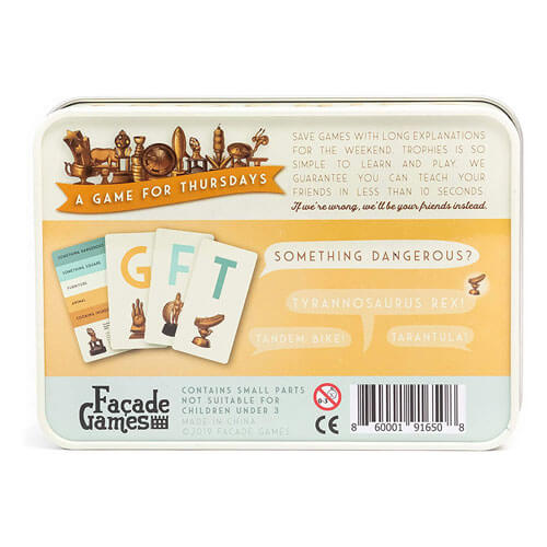 - DETAILS: Play this 5-15 minute long game with 2-30 players ages 8 years old and up. Trophies includes 70 unique trophy cards, 350 topics, and a teeny-tiny metal trophy for the winner.
