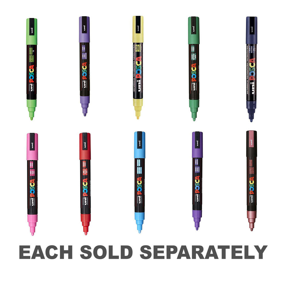 Posca Acrylic paint markers are non-toxic, water-based, and can be used on almost any surface. Alcohol and solvent free, opaque paint covers well, is blendable, and dries quickly. For use on paper, glass, cardboard, wood, porcelaine, metal, textiles, ceramics, plastic, and more - all without priming. They can even be used like watercolor when mixed with water and a brush. The PC-5M medium bullet tip marker is the 'multi-purpose' size in the Posca range. Creates neat and precise lines, and is great for coloring and writing.