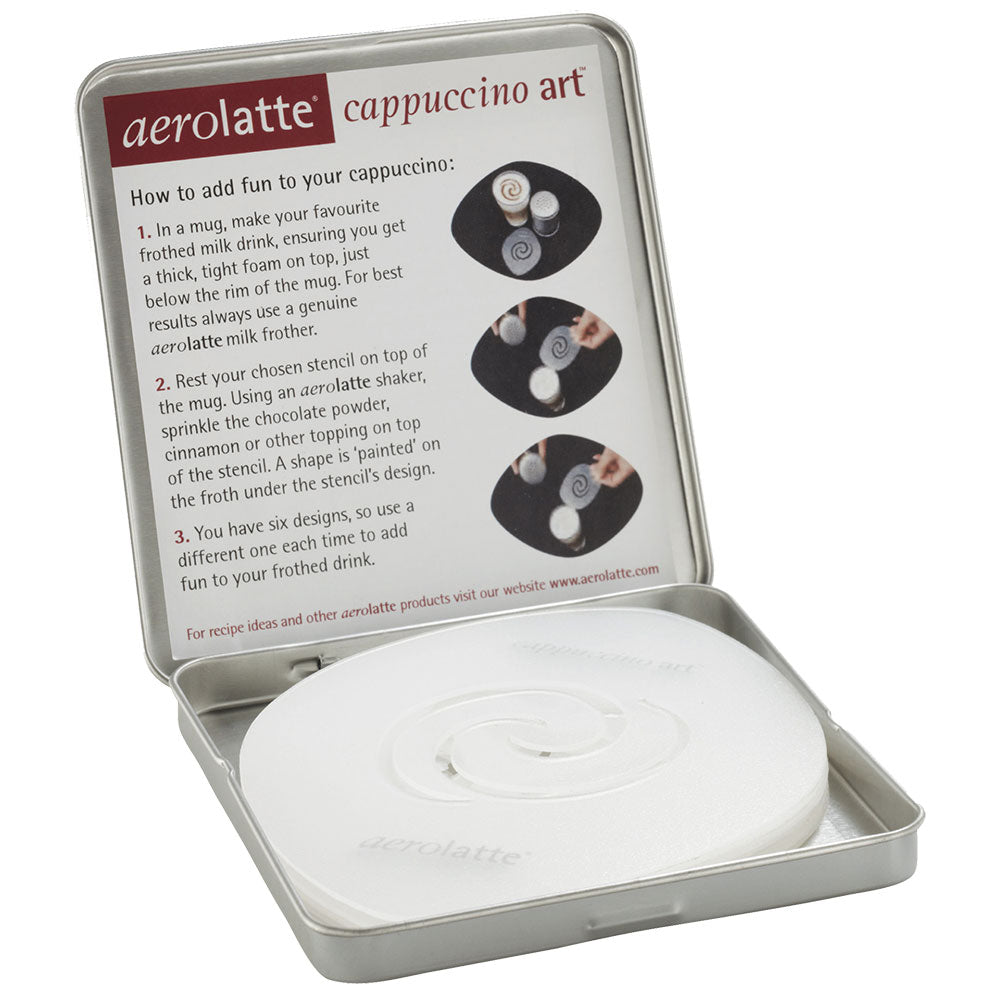 Créez des designs de type barista pour vos boissons chaudes préférées à la maison en utilisant les pochoirs d'art cappuccino amusants d'Aerolatte.