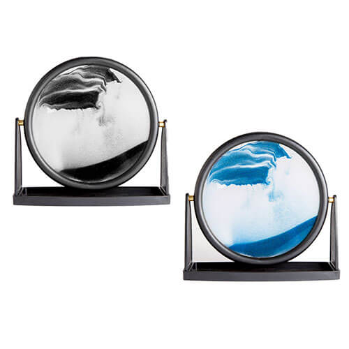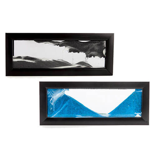 Nos cadres de sable sont disponibles en bleu et noir en deux styles - cercle et rectangle. Ils sont simples à utiliser sans pièces ou batteries mécaniques nécessaires. Il suffit de retourner le cadre et la gravité fait tout le travail! Le sable coloré est mélangé avec un liquide huileux qui fait tomber le sable lentement et il fera des motifs fascinants de tourbillons et de tourbillons alors qu'il dégringole du haut du cadre vers le bas. Il est difficile de vous déchirer les yeux!
