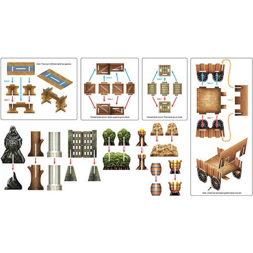 • Le pack contiendra environ 4-5 planches de punch remplies d'obstacles assemblés rapides qui incluent (mais sans s'y limiter): barils, plantes en pot, coffres, meubles (chaises et tables), piliers, roches et arbustes, portes, flammes d'espoir, et les urnes du désespoir.
