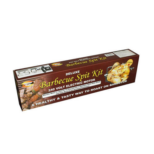 Ensemble de broche de barbecue de luxe. Le moteur électrique est évalué à 12,5 kg et dispose d'un bouclier thermique en acier inoxydable et d'une inversion automatique pour une protection contre les surcharges. Convient à la plupart des barbecues à capot de 3 à 6 brûleurs