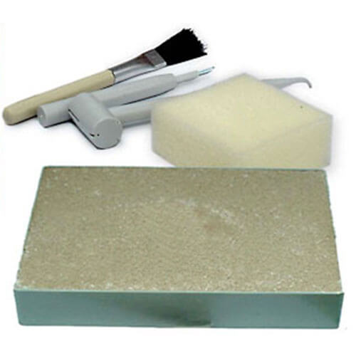 Extrayez le squelette du bloc puis assemblez-le pour constituer cette réplique de qualité. Le squelette est composé d'environ 8 pièces et les outils du paléontologue (marteau et ciseau) sont inclus dans l'emballage.