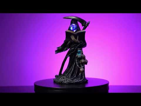 Mystérieuse Grim Reaper tenant une faux et conduit Lantern. Perché sur un croissant de lune fait de plusieurs crânes. Fabriqué à partir de polyresin robuste avec une sensation luxueuse et lourde.