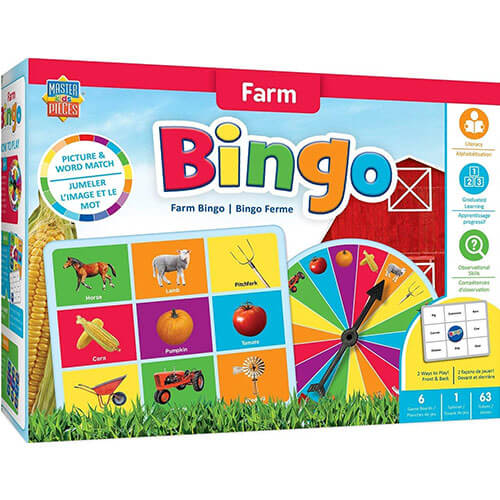 Faites les 9 matchs et soyez le premier à crier du bingo! La ferme Bingo enseigne aux enfants différentes choses que vous pouvez trouver dans une ferme reconnaître le cochon, une grange, une tomate et plus encore. Ce jeu de bingo est conçu pour les enfants de 3 ans et plus et est amusant pour toute la famille. Commencez par faire correspondre des images, puis diplôméz plus tard de l'autre côté de votre carte de bingo et trouvez le bon mot. C'est un excellent jeu pour apprendre l'alphabétisation et faire des observations tout en s'amusant. Ce jeu comprend 1 spinner, 6 planches de jeu et 63 jetons.