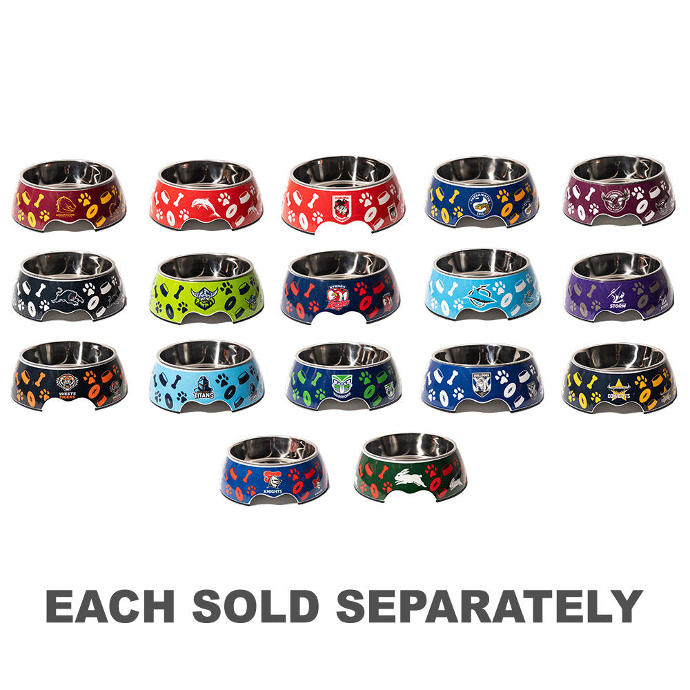 Introducing the Officially Licensed NRL Dog Bowl! Your pup can dine in style while supporting their favorite team. Featuring a non-slip rubber bottom, high-quality print on durable melamine, and a removable stainless steel insert for easy cleaning. Designed with finger gaps for convenient pickup, it measures 20cm across the bottom and 17.5cm at the top.