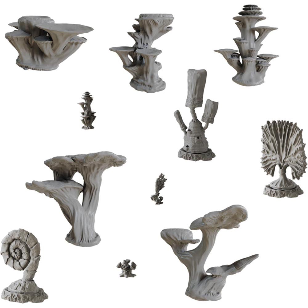 Cet ensemble d'arbres modulaires a un thème de champignons extraterrestres, mais peut facilement être combiné avec d'autres ensembles pour créer un champ de bataille visuellement magnifique, pour les jeux de fantaisie et de science-fiction. Les pièces modulaires ont des trous de 5 mm pour les aimants (non fournis), pour les joueurs qui souhaitent recombiner leurs arbres pour chaque jeu!