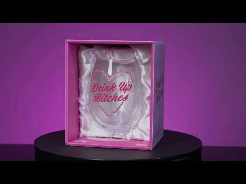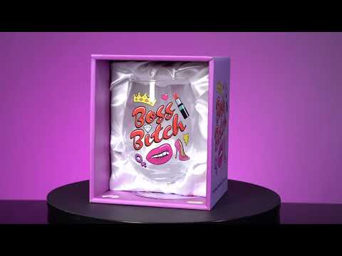 Sirotez votre vin de ce verre comme le boss b * tch vous êtes! Verre sans tige soufflé à la main avec des icônes de femmes audacieuses et de style pop art. Bubble Red Text lit "Boss Bitch"