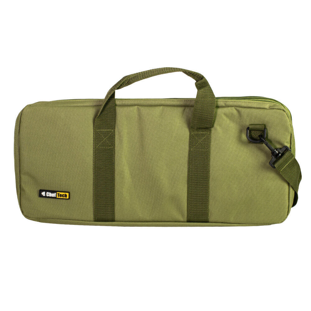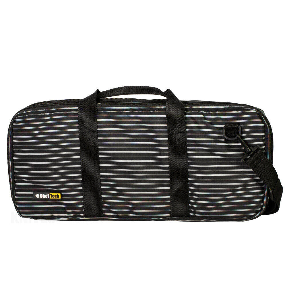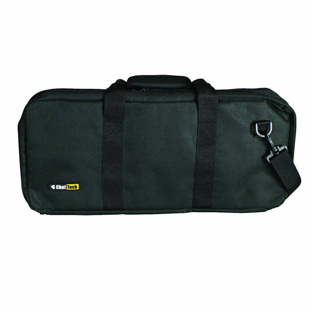 La borsa a rotolo di coltello Cheftech contiene 18 tasche ed è realizzato con tessuto Derier imbottito 600 e offre 3 scomparti ventilati separati per coltelli e accessori. La borsa si arrotola comodamente per un facile trasporto con manici, tracolla e deposito I.D.