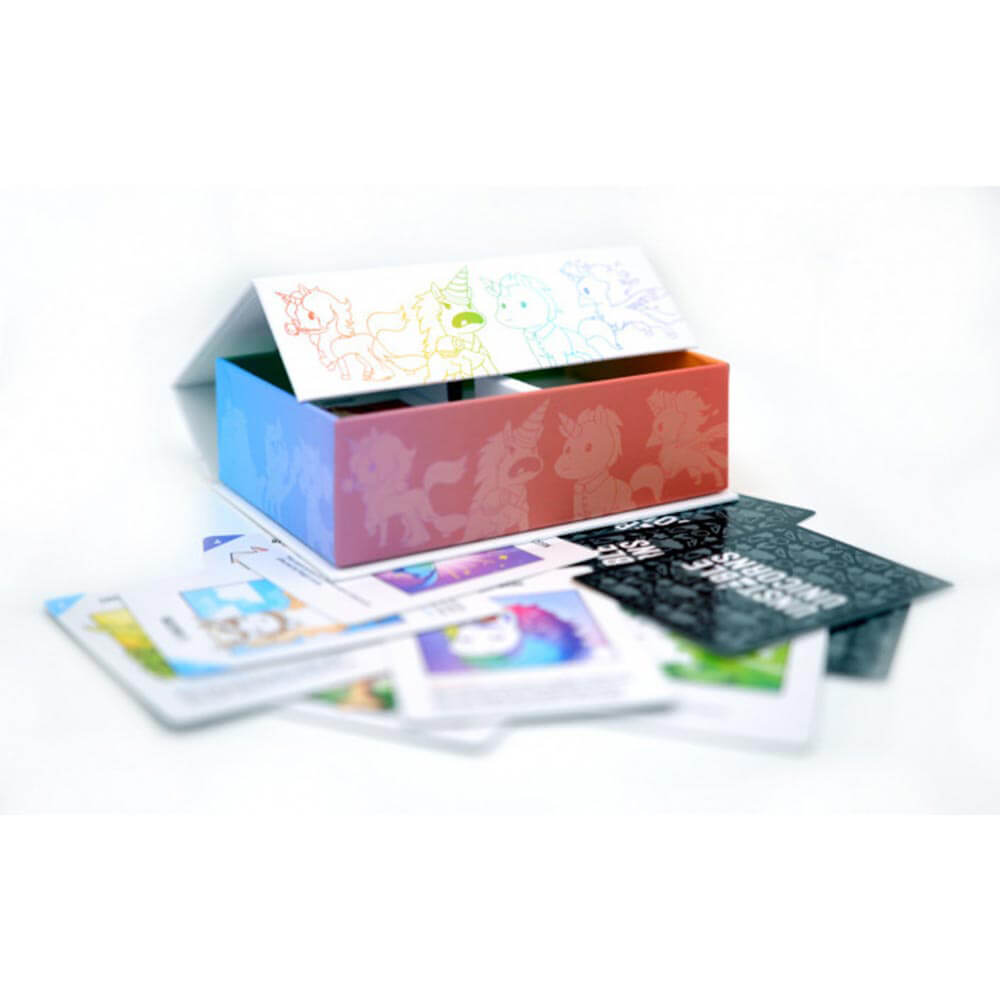 Ma non attaccati troppo, perché anche i baby unicorni non sono al sicuro in questo gioco! Ci sono oltre 20 unicorni magici da raccogliere e ognuno ha un potere speciale. Costruisci il tuo esercito di unicorno il più velocemente possibile o lasciati distruggere da uno dei tuoi cosiddetti amici! Cerca vendetta o proteggi la tua stalla usando la tua magia! Sembra facile? Non così in fretta. Qualcuno potrebbe avere una carta vicina (prendilo? Vicino?) E mandare il gioco in follia! La prima persona a completare il loro esercito unicorno sarà di seguito conosciuta come il giusto sovrano di tutte le cose magiche ... almeno fino alla prossima partita. Buona fortuna.