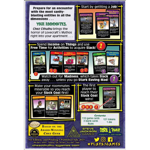 Preparati per un incontro con le entità più esplosive in questa o in qualsiasi dimensione. . . I tuoi coinquilini. Chez Cthulhu combina il classico sistema Chez Geek con il dio anziano preferito di tutti, si agita in un nuovo meccanico di follia e dà alla luce innaturale un gioco autonomo progettato da Steve Jackson e illustrato da John Kovalic.