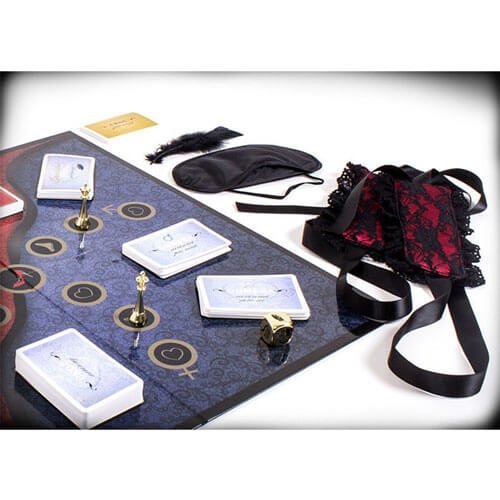 - Cosa c'è nella scatola: 252 carte; tavolo da gioco; 2 pedine metalliche; dadi metallici; manette eleganti; benda; frusta; piuma; candela profumata; petali di rosa; regolamento