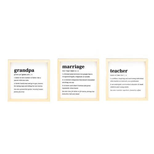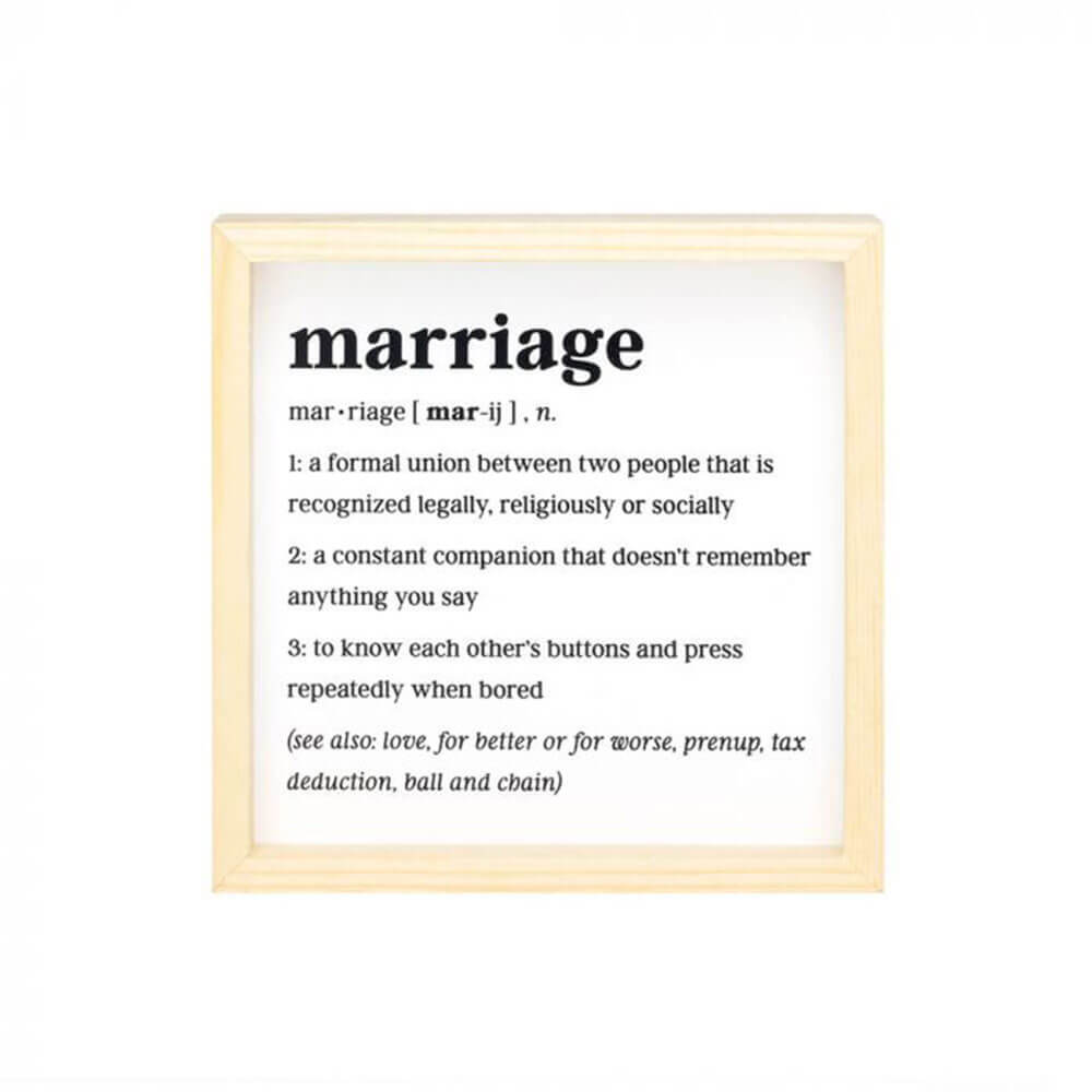 Questa mini arte incorniciata definita presenta un design in bianco e nero minimalista con una definizione di matrimonio originale. Il regalo perfetto per il tuo altro significativo per celebrare un anniversario o solo perché!