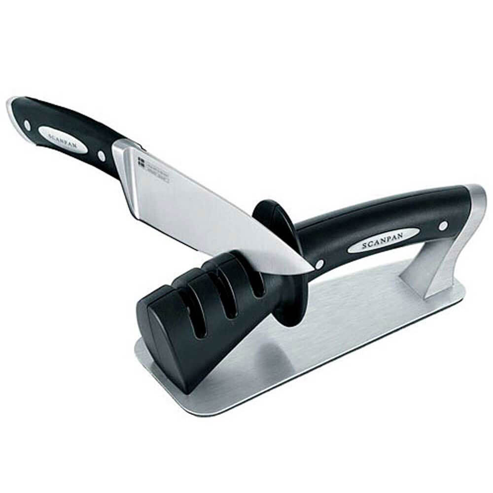 Abbattendo il processo di affilatura corretta di un coltello in tre semplici fasi, questo affiliatore di coltelli ScanPan rende facile e veloce dare ai tuoi coltelli da cucina contundente un contratto di vita completamente nuovo. Con un affiliatore in carburo di tungsteno, un affiliatore di diamanti e una piastra in ceramica, è una soluzione di qualità per la tua cucina.