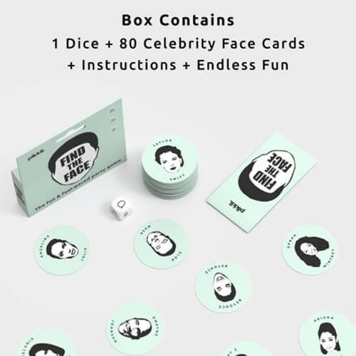 Il gioco divertente e frenetico di trovare prima i volti famosi. Include: 1 dadi, 80 carte di celebrità, istruzioni e divertimento senza fine!