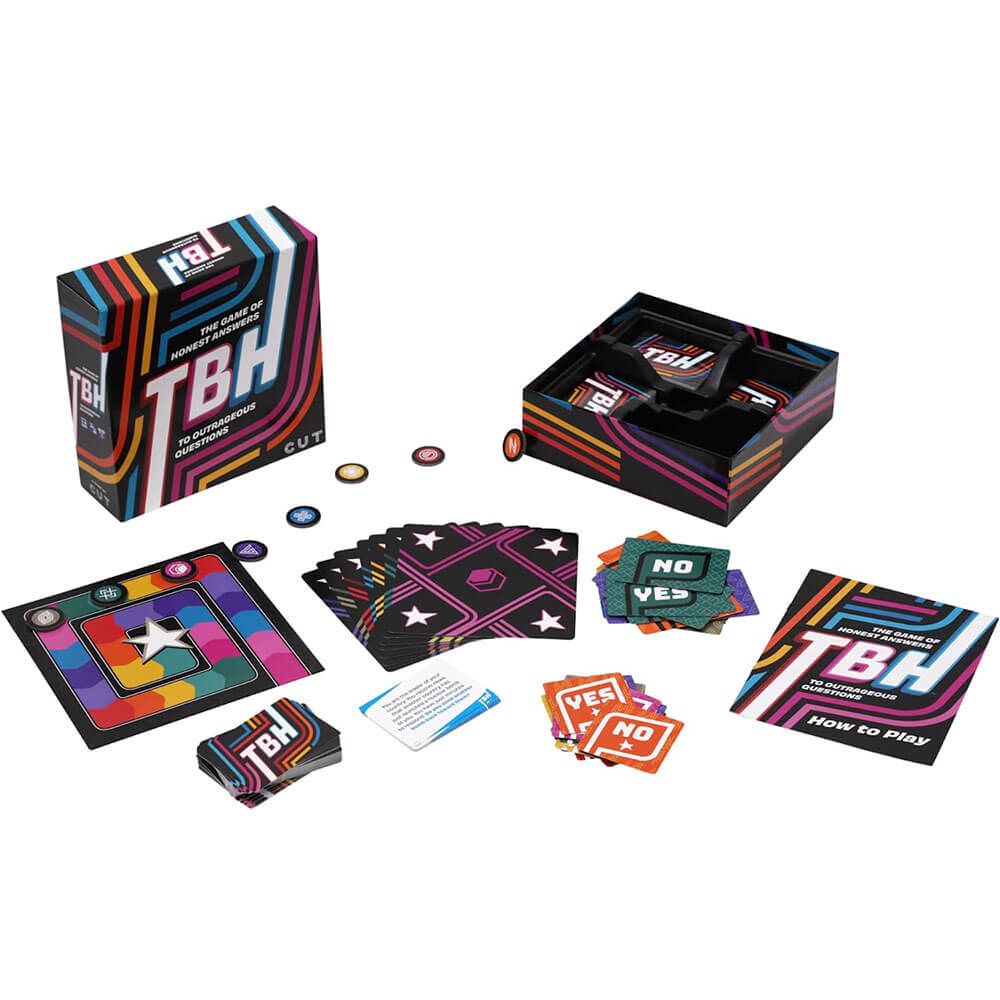 TBH è un gioco sulla creazione di dilemmi assurdi e quindi prevede come reagiranno gli altri giocatori. I punti vengono assegnati per aver indovinato correttamente le risposte degli altri giocatori. Il gioco è composto da varie carte, un board di giocatore per ogni giocatore e un tracker board.