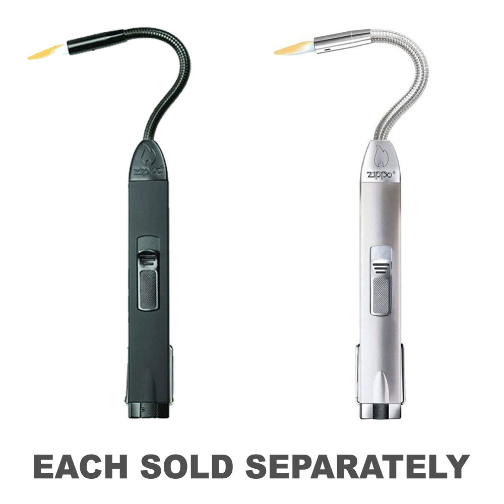 L'accendino di utilità per esterni a collo flessibile Zippo è una costruzione in alluminio nero piatto con inserti gommati. Tecnologia a doppia fiamma resistente al vento. Il collo esteso flessibile, sormontato da un ugello sottile e potente, si adatta facilmente a tutte le aperture di illuminazione. Sistema di accensione avanzato. Indicatore a livello di carburante. Pulsante di sicurezza resistente ai bambini brevettato a fiamma regolabile. Loop sospeso inossidabile. Ideale per campeggio, lanterne, caminetti, torce tiki, griglie, fuoco e altro ancora. La forma standard della custodia con angoli arrotondati e superiore con un fondo piatto. Una cerniera a cinque barili si unisce alla parte superiore e al fondo. Ha un inserto standard con 16 fori nel camino (8 per lato). Il fondo è timbrato con il logo Zippo del periodo autentica questi accendini come Zippo autentico.