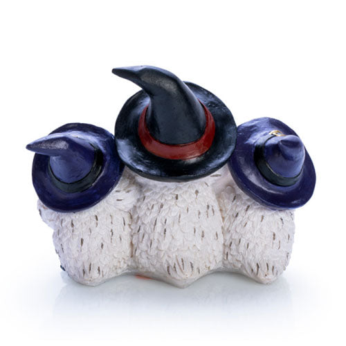 Verspielte Familie von Schneeeulen mit Hexenhüten. Die Federtextur und die schwarzen Fleckendetails sehen genauso aus wie das echte Tier. Hergestellt aus robustem Polyresin mit einer luxuriösen, schweren Haptik.
