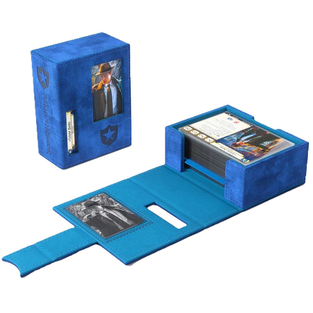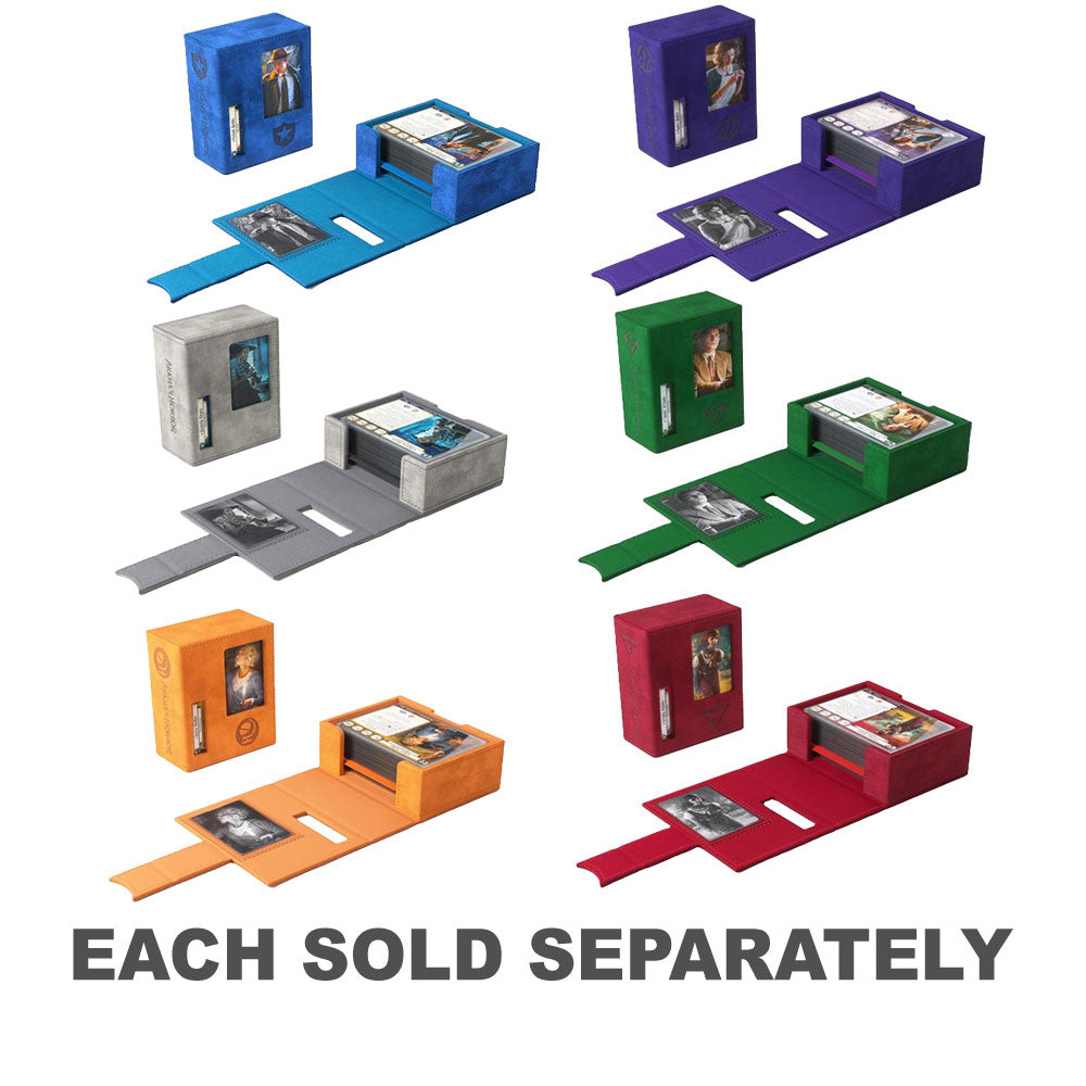 Ohne das Kontrollkästchen öffnen zu müssen, können Sie Ihr Ermittlerdeck auf den ersten Blick durch die Ausschnitte überprüfen, die das Porträt, die Klasse, den Namen und das Merkmal des Decks anzeigen. Jede Box enthält einen Kartenteiler in passender Farbe.