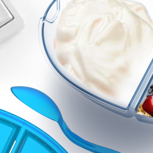 • Deckel abnehmen und das kleinere Fach in den Joghurt klappen
