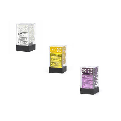 Block mit 12 klaren und weißen 16 mm durchscheinenden sechsseitigen Würfeln.
