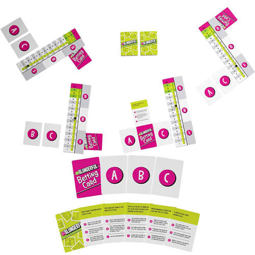 Das Spiel hat lustige, nicht anstößige Inhalte, die für Erwachsene geeignet sind, sodass Sie mit all Ihren erwachsenen Freunden und Ihrer Familie spielen können. Die strategische Wettkomponente erhöht die Einsätze für konkurrierende Spieler und hält alle Spieler in jeder Runde involviert. Jeder Spieler hat seine eigene Wett-Scorecard, mit der er seine Wetten platziert. Lies die Blunderful-Karte und wähle im Geheimen, wie du reagieren würdest. Andere Spieler platzieren ihre Wetten darauf, wie Sie ihrer Meinung nach reagieren würden. Alle verraten ihre Antworten. Spieler, die die richtige Antwort erraten haben, erhalten die Punkte, die sie gesetzt haben, aber diejenigen, die falsch geraten haben, verlieren die Anzahl der Punkte, die sie gesetzt haben. Die erste Person, die 100 Punkte erreicht, gewinnt.