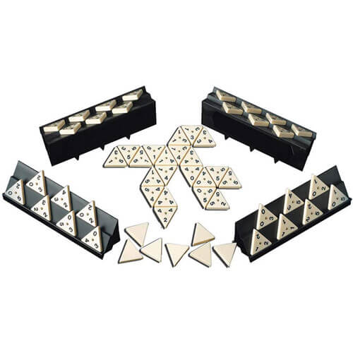 Das klassische dreieckige Dominospiel. Sammle Punkte, indem du Zahlen auf den dreiseitigen Kacheln mit Messing-Spinnern abgleichst.
