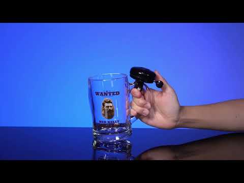 • Bierkrug aus Glas mit einer schwarzen Glocke am Griff – klingeln Sie, wenn es Zeit für ein weiteres Getränk ist!