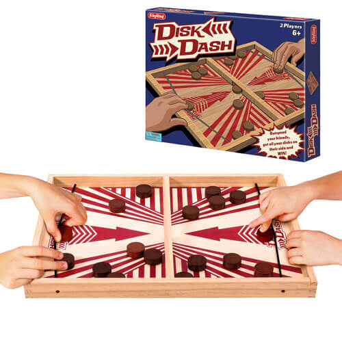 Es ist ein schneller, wilder, hektischer Spaß in einer Kopf-an-Kopf-Herausforderung, während Sie versuchen, alle Ihre Scheiben durch das Tor auf die Seite Ihres Gegners zu schießen. Ziehen Sie das Gummiband zurück und schleudern Sie Ihre massiven Holzscheiben durch die Öffnung, um zuerst alle zu bekommen ihre Festplatten durch ist der Gewinner