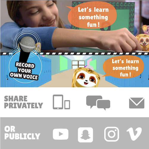 Bewegen Sie die niedlichen Charaktere zwischen der Kamera und dem grünen Bildschirm. Die App animiert die Charaktere in Echtzeit und Sie können Voice-Over oder Musik hinzufügen, um einen einzigartigen Animationsfilm zu erstellen. Da die Gesichter der Kinder nicht auf dem Bild zu sehen sind, sondern nur die entzückenden Zeichentrickfiguren, können Sie es sicher online veröffentlichen, wenn Sie dies wünschen. Sie können sich auch dafür entscheiden, nur mit Ihren privaten Social-Media-Konten zu teilen, um sie mit Freunden und Familie zu teilen.